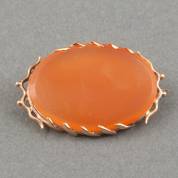 14kt gouden broche gezet met plat ovaal geslepen carneool, brutogewicht 6,4 gram, 3 × 2 cm