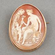 14kt gouden cameebroche gezet met schelpcamee met beeltenis van Venus en Cupido met fakkel, brutogewicht 11,8 gram, 4,5 3,5 cm -speld onedel-