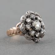 14kt gouden rozetring met 49 roosgeslepen diamanten in diverse groottes gezet in zilver, totaal circa 0.70ct, mt. 17,5, brutogewicht 4,0 gram