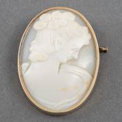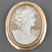 20kt gouden cameebroche met fijn gestoken schelpcamee van godin Flora, brutogewicht 14,0 gram, circa 5 × 4,5 cm