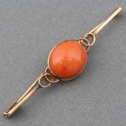 14kt gouden broche met ovaal cabochongeslepen bloedkoraal, brutogewicht 7,4 gram