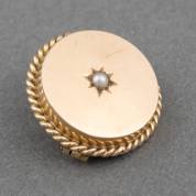 14kt gouden ronde broche, gezet met zaadpareltje, brutogewicht 2,8 gram, Ø 2 cm