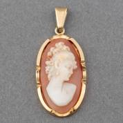 14kt gouden hanger gezet met schelpcamee van dame en profil, brutogewicht 3,0 gram, circa 3 cm