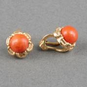 Paar 14kt gouden oorclips gezet met cabochongeslepen bloedkoraal, brutogewicht 5,6 gram, Ø 1,2 cm