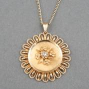 14kt gouden gourmet schakelcollier, waaraan een ronde gesatineerde hanger met bloemdecor en gezet met roosdiamantje, brutogewicht 13,6 gram, 42 cm, Ø 3,5 cm