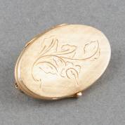 Ovale 14kt gouden medaillonbroche met gesatineerd decor en gegraveerd bladdecor, gewicht 5,0 gram, 2,8 × 1,8 cm -achterzijde gegraveerd '10-4-73'-