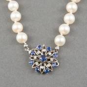 Sautoir van gecultiveerde parels aan BWGG witgouden bloemslot gezet met negen blauwe rond gefacetteerde saffieren en acht briljantgeslepen diamanten, brutogewicht 52,0 gram, 77 cm