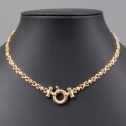 14kt gouden fantasie schakelcollier aan sierslot gezet met vier cabochongeslepen simuli voor smaragd, brutogewicht 24,2 gram, lengte 42,5 cm