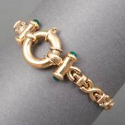 14kt gouden fantasie schakelarmband aan sierslot gezet met vier cabochongeslepen simuli voor smaragd, en twee losse schakels, brutogewicht 13,4 gram, 18,5 cm -een tweede simuli met kleine chips is los bijgevoegd-