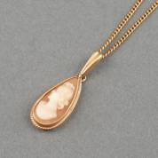 14kt gouden gourmet schakelcollier waaraan 14kt gouden druppelvormige hanger met schelpcamee van dame en profil, brutogewicht 5,8 gram, 46 cm