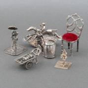 Zes zilveren miniaturen, veelal 2e gehalte: hobbelpaard, doedelzakspeler, man met kar, stoel, parapluventer, en inmaker, gewicht 107 gram