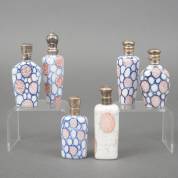 Vijf porseleinen parfumflacons met rood, blauw en goud decor, veelal met 2e gehalte zilveren montuur en dop, drie binnenstopjes aanwezig, daarbij: één porseleinen parfumflacon met rood en goud decor en 2e gehalte zilveren montuur en dop, meester: Simon Pots, Oude Pekela, 1816-1829, circa 9 cm -één dop los-