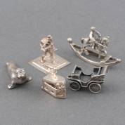 Vijf zilveren miniaturen: hobbelpaard, strijkijzer, doedelzakspeler, automobiel en zeehond, gewicht 56 gram, zeehond 4 cm