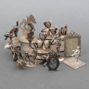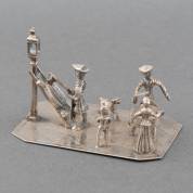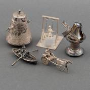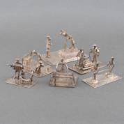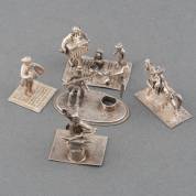 Vijf zilveren miniaturen, voornamelijk 2e gehalte: schaatsenrijders, kaasdragers, orgelman, timmerman, beul, en mannen bij vuurpot, gewicht 136 gram