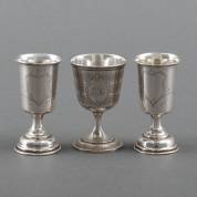 Drie 3e gehalte zilveren cups, waarvan één paar, de ander met gegraveerd monogram, gewicht 48 gram, circa 7,5 cm