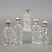 Vijf kristallen parfumflacons met veelal 2e gehalte zilveren montuur en dop, één verguld en met glazen binnenstopje, grootste 12 cm