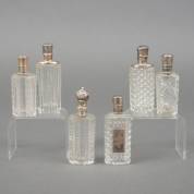 Zes kristallen parfumflacons met veelal 2e gehalte zilveren montuur en dop, alle binnenstopjes aanwezig, grootste 9,5 cm