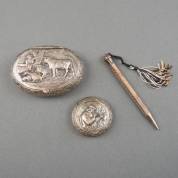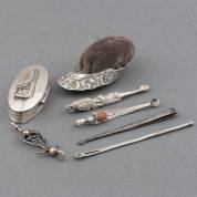 Ovaal 1e gehalte zilveren pillendoosje, het deksel gesierd met golfclub- en bal, 1e gehalte zilveren schoenvormig speldenkussentje, Londen, 1894, daarbij: zilveren naald, en drie Oosterse specerijenlepeltjes, brutogewicht 40 gram, schoen 5,5 cm, doosje 5 × 2,5 cm