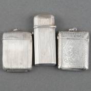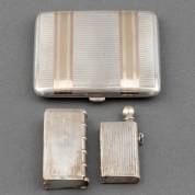 Twee 2e gehalte zilveren tondeldoosjes, waarvan één in boekvorm, daarbij: 1e gehalte zilveren (935/1000) sigarettenkoker met deels verguld lijnendecor, gewicht zilver 160 gram, koker 9 × 8 cm