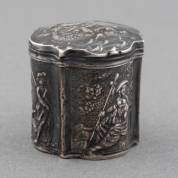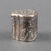 Zilveren lodereindoosje met gedreven decor van scenes met figuren, bodem met inscriptie: EVWB' gekeurd met belastingkeur voor oude en inlandse werken 1893-1906, gewicht 22 gram, 3,5 × 3,5 × 3,2 cm