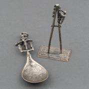 2e gehalte zilveren lepel met Jezus aan het kruis, en 2e gehalte zilveren miniatuur: werkman in elektriciteitsmast, gewicht 58 gram, miniatuur 9 cm