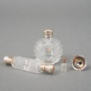 Twee kristallen parfumflacons met 2e gehalte zilveren montuur en dop, één flacon met twee compartimenten met twee kurken binnenstopjes, daarbij: miniatuurparfumflesje en zilveren trechtertje, langste 11 cm
