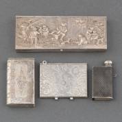 2e gehalte zilveren postzegelbewaardoos met gedreven oud-Hollands decor en plek voor vier soorten zegels, twee 2e gehalte zilveren tondeldoosjes, waarvan één met niëllo decor en draagbare 2e gehalte zilveren dubbele fotolijst met knip en rocailledecor, (bruto)gewicht 163 gram, bewaardoos 1 × 10 × 4 cm
