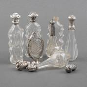 Zeven kristallen parfumflacons met 2e gehalte zilveren monturen, diverse meesters, 19e eeuw -diverse met defect of los montuur-