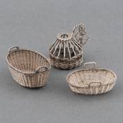 Drie zilveren miniaturen: mand voor gevogelte, 18e/19e eeuw en twee gevlochten manden, 19e eeuw, gewicht 23 gram -geen keuren-