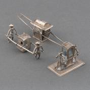 Drie zilveren miniaturen: draagstoelen, één niet Nederlands gekeurd, gewicht 74 gram, met onderplateau 4,5 × 5 × 3 cm