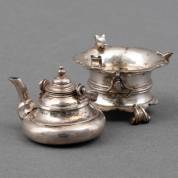 Zilveren miniatuur: komfoor met ketel, komfoor meester: Arnoldus van Geffen, Amsterdam, 1762, ketel niet gekeurd, vermoedelijk 18e eeuw, gewicht 71 gram, hoogte komfoor 3 cm