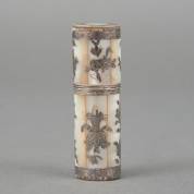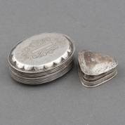Twee 2e gehalte zilveren lodereindoosjes, één meester: Carolus Hendricus Cammans, Leeuwarden/Groningen1860-1882, de ander meester: Christiaan Jacobs Bruinings, Joure, 1884, gewicht 43 gram, circa 5 cm -gebruikssporen-