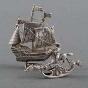 Twee zilveren miniaturen: zeilschip op standaard en hobbelpaard, circa 1820, gewicht 57 gram schip 8 cm