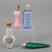 Vier divers gekleurde kristallen parfumflacons met veelal 2e gehalte zilveren montuur en dop, één met glazen binnenstopje, grootste 8,5 cm