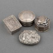 Drie zilveren pillendoosjes en één deksel van een lodereindoosje, diverse gehaltes en uitvoeringen, gewicht 56 gram, rond model Ø 3,5 cm