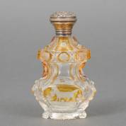 Kristallen parfumflacon met gele details en graveringen van bloemen en een hondje, verguld 2e gehalte zilveren montuur en dop met kurk en zilveren binnenstopje, 10 cm