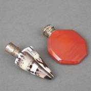 Rode jaspis parfumflacon met defecte zilveren dop, en een parfumflacon met 2e gehalte zilveren montuur en dop met binnenstopje gevormd uit schelp, rode flacon 6,5 × 5 cm