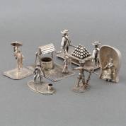 Zes zilveren miniaturen, veelal 2e gehalte: parapluventer, zeeman met anker, vrouw bij waterput, visser, kaasdragers, en vrouw in een strandstoel, gewicht 132 gram