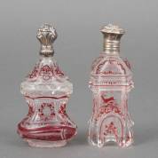 Twee Boheems glazen parfumflacons met 2e gehalte zilveren montuur en dop, één met glazen binnenstopje, grootste 11,5 cm