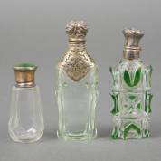 Groen kristallen parfumflacon met verguld zilveren dop en glazen binnenstopje, parfumflacon met groene motieven op het glas en 2e gehalte zilveren montuur en dop en glazen binnenstopje, en kristallen parfumflacon met groen geëmailleerde 1e gehalte zilveren dop, grootste 9 cm -gebruikssporen-