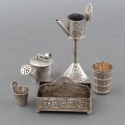 Vijf zilveren miniaturen: snotneus, bestekkist, moppentrommel zonder hengsel, gieter, en emmer, gewicht 66 gram