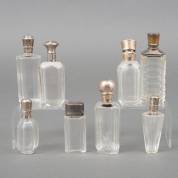 Acht kristallen parfumflacons met veelal 2e gehalte zilveren montuur en dop, drie binnenstopjes aanwezig, één verguld, en één met niëllo decor, vergulde flacon 9,5 cm