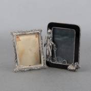 1e gehalte zilveren fotolijstje met zwart email en applique van dame met hondje gezet met paste-stenen, en 3e gehalte zilveren fotolijstje, brutogewicht 60 gram