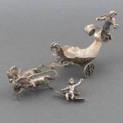 3e gehalte zilveren miniatuur: engelenkar met twee engeltjes en twee aangespannen paarden, gewicht 134 gram, 7 × 16 × 4 cm -bankje met engel defect-
