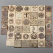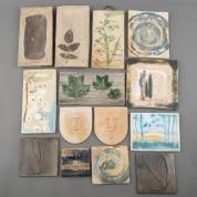 31 bruin-beigekleurige aardewerk tegels met decoratieve plantaardige en dierlijke decors,14,5 × 14,5 cm, en twaalf bruine keramiek tegels met plantaardige decors, 12 × 12 cm, uitvoering Kunstaardewerkfabriek Mobach, Utrecht -enkele kleine chips-
