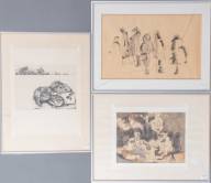 Drie werken op papier: 'Drie padden', r.o. gesigneerd met potlood V; 'Voor Christel omdat zij jarig is', achterzijde gedateerd 1964; en 'Abstracte figuren', niet gesigneerd -vergeeld, glas van een lijst gebroken-, padden 15 × 20 cm