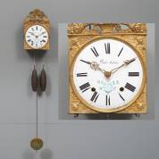 Comtoise met spillegang, de latoenkoperen feuille met decor van bloemenmand en hoorns van overvloed, adres: Pratx Antoine, 1820-1840, lengte 144 cm