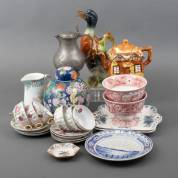Paar aardewerk kommen op voet, faience schenkkan in de vorm van een eend, porseleinen gemberpot, zes porseleinen kop-en-schotels, aardewerk theepot, tinnen klepkan, etc. -enkele defecten-, schenkkan 33 cm