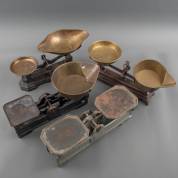 Vier diverse gietijzeren en metalen weegschalen, 20e eeuw -gebruikssporen-, 25 × 50 × 21 cm, herkomst: Kruideniersmuseum Utrecht