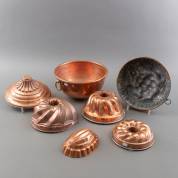 Roodkoperen beslagkom en zes diverse koperen vormen, 19e eeuw, Ø beslagkom 27,5 cm